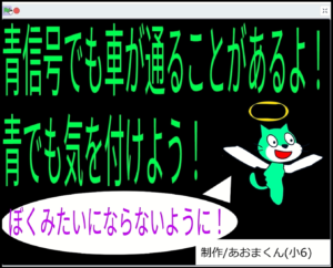 ここあそ思いやりCMコンテストは、スクラッチを学ぶ高学年を対象に、諏訪町駅前の大型ビジョンで放映される10秒CMを月2本ずつ子どもたちに制作をお願いしています。交通安全の啓発、自転車の盗難防止、障がい者の方への配慮等、社会生活での思いやりがテーマです。